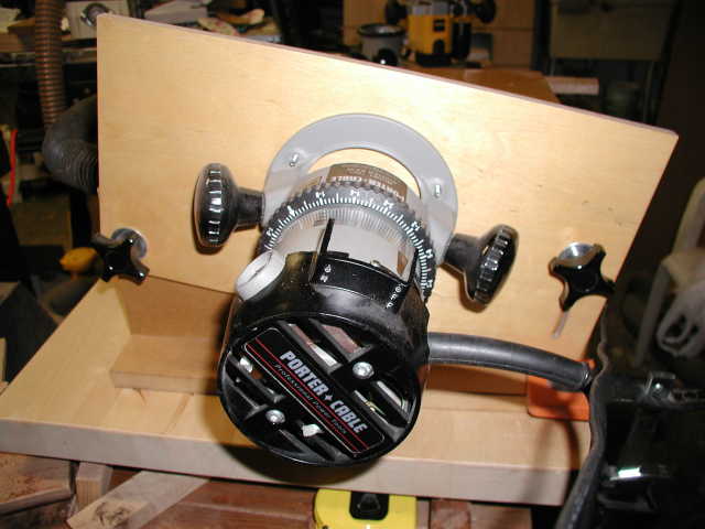 Now, the router side of the table. Good old Porter-Cable 690 is just fine in this use. The knob on the left is a fixed pivot, the one of the right is the height adjustment.