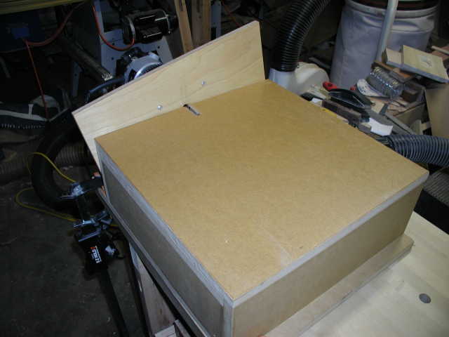 Here's an overall view of the horizontal router table. The entire thing, except for the "fence", is made of MDF, held together with biscuits. The inspiration for this came from a short article in Fine Woodworking by Ernie Conover, probably in late 2000 or early 2001.