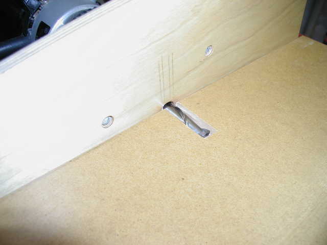 A close-up view of the cutter and fence. The two sets of lines show me the approximate start and end for the two sizes of bits I use in the table, 1/2" and 1/4". This is a 1/2" diameter, 1 1/2" cutter length, carbide upcut spiral from Whiteside. It is a very expensive bit, but works simply beautifully.